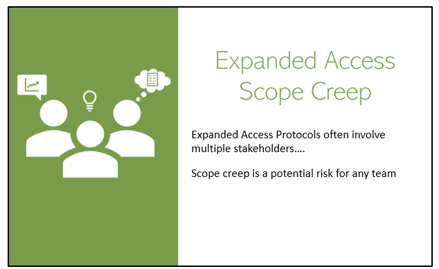 The issue of scope creep will grow slowly and unnoticed and only recognized when the project outgrows its capacity. Why does it occur? Scope Creep occurs because the scope of a project is not properly defined, documented, or controlled. How do we avoid this concept in Expanded Access Programs?